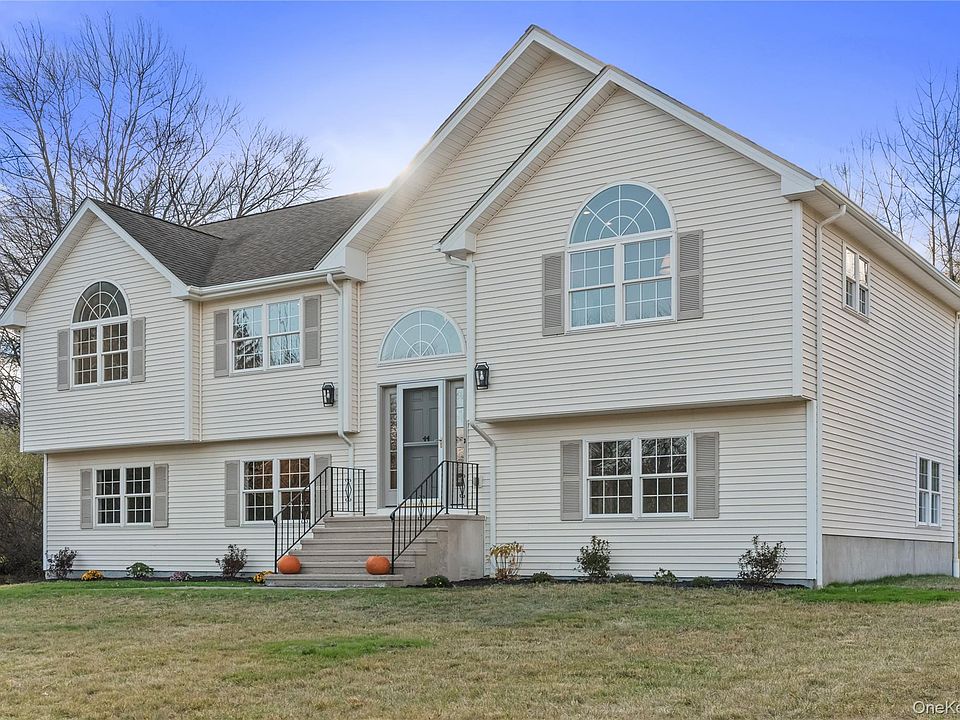 Bright and renovated contemporary raised ranch with public sewer, public water, and a new boiler! This beautifully updated home offers plenty of space and natural light throughout. The upper-level features new and refinished hardwood floors, an eat-in kitchen with new quartz counters, backsplash and stainless steel appliances (gas range!), and modern designer fixtures and hardware throughout. Cathedral ceilings across most of the home add to airy feel, and the comfort continues as you retreat to the primary suite, complete with three large closets and a private ensuite bath with double vanity. Off the dining room is the deck overlooking a private 1+ acre yard. The expansive lower level boasts a separate entrance, family room with wet bar and beverage fridge, a full bath and a flexible bonus space, perfect for an in-home office or 4th bedroom. Located on a quiet dead-end street just minutes from town, the hospital, and major transportation, this move-in-ready home combines comfort, style, and convenience.