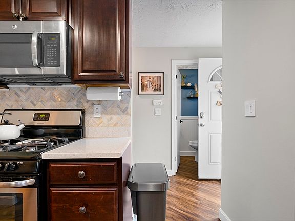Delight in the updated move in quality of this beautiful end-unit townhome. Abundant living space and high end finishes including hardwood & LVP floors, quartz counters, stainless steel appliances and gorgeous hardwood cherry-stained cabinetry. 0pen concept living/dining room has a cozy wood-burning fireplace for those cool nights. On warmer days, open the patio door to your private deck for sipping morning coffee or evening cocktails. Lots of room to play or party year round in finished lower level with built in wet bar. Primary bedroom suite has walk-in closet, built in vanity & opens to the well appointed bath. Convenient second floor laundry room - washer and dryer included. Bonus private third level room with built-ins makes a great home office or guest quarters. Current owners have made many updates including new windows, hot water heater, dishwasher and flooring. Association pool, clubhouse and tennis courts and a convenient location close to highways, shopping and recreation.