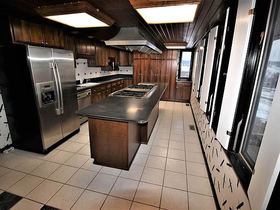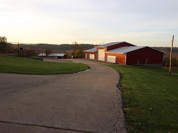 Custom built 'Frank Lloyd Wright' style home with approximately 5900 square feet of finished living space, 5 bedrooms, 3.5 baths, and 2 kitchens. So much to offer with custom cabinetry, redwood ceilings, limestone walls and fireplaces, open and enclosed decks, and much more. The elaborate main kitchen offers a spacious island featuring stainless steel appliances including two full size Viking ovens, griddle, grill, six burners, deep fat fryer and large hood. The large 12 + seating dining area is all-inclusive and defines the style of the home, as does the grand living room with expansive windows, ceiling height and large stone fireplace. The master bedroom offers ample space with fireplace and balcony, large master bath and closet space. This home is very unique located in St. Donatus, IA, the Luxembourger village with historic architecture along the Great River Road. You'll appreciate the tremendous views of the surrounding hillsides and valleys. Also included is a 48 x 100 out building that is climate controlled to hold up to 16 of your Classic/Collector Cars. The additional square footage of the outbuildings could easily have HVAC added giving room for a total of 45 protected vehicles, and a bonus basement level for more storage. The 40 x 80 utility building has insulated shop with white metal interior, and a storage area with upper deck. All this and a stocked pond and 14 acres of timber with mature hardwoods that have been appraised and add extra value, recreation, hunting and income. So much to offer and too much to list.