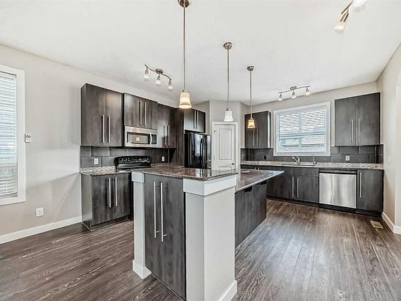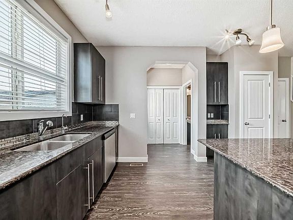 The one you’ve been waiting for! This beautifully updated, freshly painted 1,600 sq. ft. two-storey is tucked into the vibrant community of Skyview Ranch, just off Metis Trail for quick and easy access. Step inside to a bright, open-concept layout with large, sunlit windows and warm, seamless LVP flooring throughout. The inviting living room is centered around a cozy gas fireplace, while the modern kitchen boasts granite countertops, a central island, pantry, and a sink perfectly placed under the window with a view of the backyard. A convenient half bath completes the main floor. Upstairs, you’ll find three generous bedrooms, including a spacious primary retreat with a walk-in closet and a sleek 4-piece ensuite. A second full bath and upper-level laundry bring everyday convenience. The fully developed basement expands your living space with a fourth bedroom, a stylish 3-piece bath, wet bar, and a massive family room—ideal for entertaining or unwinding. Outdoors, enjoy a welcoming front veranda, covered porch, and a sunny south-facing backyard with a raised deck, stone patio, planter boxes, and room for RV parking. The double detached garage provides secure parking and extra storage. Perfectly located, this home is just steps from parks, playgrounds, and walking paths, with quick access to shopping, restaurants, schools, public transit (routes 145, 128 & 136), and major routes including Stoney Trail and Deerfoot. Quick possession is available. Easy to add side door.