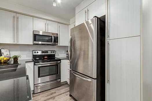 Open House Sun Oct 26, 2 to 4 pm. Living at the lake in Mahogany provides a lifestyle that everyone loves and can enjoy all year long. Grab your book and your lunch and escape to the lake for an hour or take the children after school for playtime before dinner and bedtime, or maybe a skate with friends and neighbors during the winter months. This great two-bedroom Condo checks all the boxes. Ideally located on the main floor, near the front entry and the elevator and not far from the parking stall. Featuring huge windows that brings in lots of natural light, freshly painted walls, new Luxury Vinyl plank flooring and upgraded lighting, including two ceiling fans plus granite counter tops with undermount sink, designer backsplash and stainless-steel appliances give you a classy modern place to call home. This bright open floor plan offers two good-sized bedrooms, the primary bedroom with huge windows overlooks the patio, the 2nd bedroom is great for guests or a home office and both bedrooms have full-sized closets. The 4-piece bathroom has tile floor, shelving above the toilet and a vanity with large vessel sink. The well-planned u-shaped kitchen overlooks the large living area, has lots of counter space, a flush eating bar and pantry. In-suite laundry with stacking washer and dryer. The good-sized patio with stone columns and gas line to BBQ, is accessed from the living room and is convenient to visitor parking making it easy for your visitors to stop by and is away from the main road. This great location is within walking distance of the lake, all the shopping and dining experiences you could want are very close by, plus South Health Campus for medical appointments, the car wash, your favorite ice cream parlor, parks and playgrounds and walking paths and so much more. Easy access to downtown and all major roads. This Condo is vacant and ready for a quick possession, book your showing today!