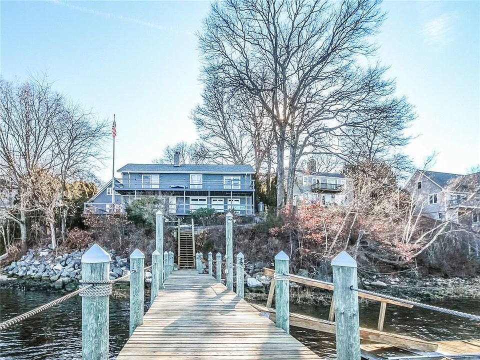 Waterfront splendor on Salt Pond nestled in the picturesque Harbour Island neighborhood. Completely renovated contemporary, modern design. Blissful setting high above the water with stunning views enjoyed from all rooms. Artfully designed to harmonize with its magnificent waterfront location, this sleek modern residence exudes contemporary style. An informal dining area adjoins the Gourmet kitchen. The kitchen flows into a fireplaced living room overlooking the water. The perfect setting for gathering with friends. The lower level features a full kitchen & a waterside wraparound deck that is partially covered. The main level features a deck with further stunning views. Both span the entire length of the house and offer distinct options for relaxing and entertaining. The master bedroom, living room & family room affords access to the decks allowing for a harmonious flow between indoor and outdoor living. The property also includes a separate two car garage with a spacious loft above offering sensational water views. Ideal for a guest cottage, studio or in-law apartment. Deep water dock with 3 boat slips, running water and electric. Narragansett's famous beaches, boutiques and restaurants are moments away from this perfect retreat. This is an ideal property from which to enjoy the beauty of the Island and all the best Narragansett has to offer.