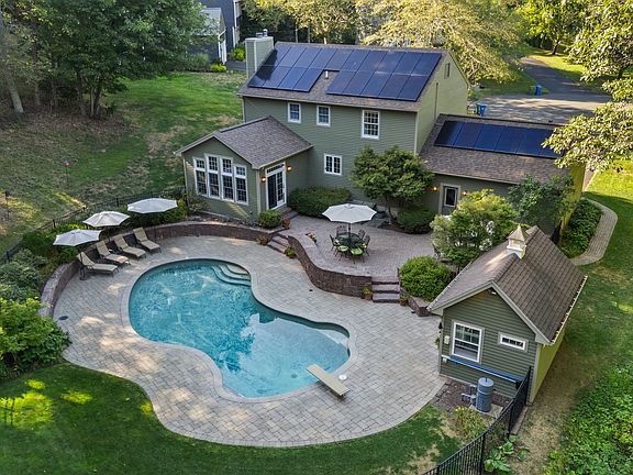 This stunning Colonial home combines elegance, comfort, and privacy in a picture-perfect setting. Nestled at the end of a quiet cul-de-sac, it backs to open space and feels like new construction thanks to its pristine condition, beautifully refinished wide board floors, and many updates (driveway 1yo, central a/c 3yo, roof 4yo, EV charger). The formal living room with fireplace opens to a bright home office through French doors. A sun-filled family room features a wall of windows and sliders leading to the patio. The open-concept dining room and eat-in kitchen boast a large island breakfast bar and stainless-steel appliances - ideal for entertaining. Upstairs, the primary suite offers a full bath and walk-in closet, complemented by three additional bedrooms. The finished basement includes a workout room and rec room for extra living space. Enjoy summer days in your private backyard oasis - complete with an in-ground pool, expansive patio with custom stone walls, and pool house with changing facilities. Move-in ready, beautifully maintained, and located in a most desirable neighborhood - this home is truly a rare find.