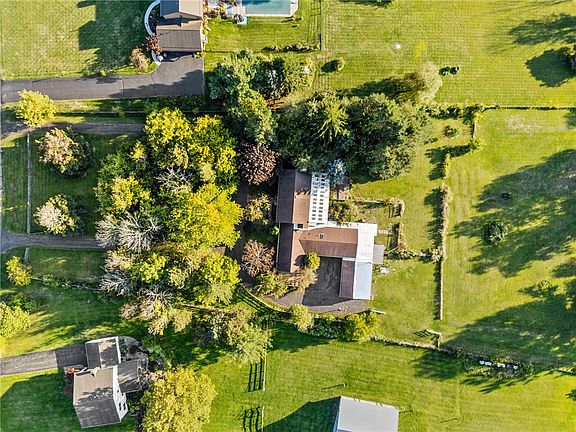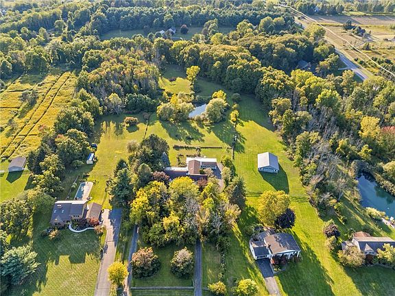 Endless Potential on a Private Ranch Setting! Step into a once-thriving ranch property brimming with possibilities. Set on a picturesque 5.7 acre parcel featuring a former three-hole golf course with a bass-filled pond and its own island, this unique home feels like your personal retreat yet is just minutes from Mendon Ponds Park and the town of Mendon. Horses are welcome here, and the grounds include a six-bay garage with stalls—perfect for farm equipment, tack storage, or a car enthusiast’s collection.