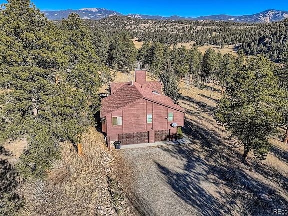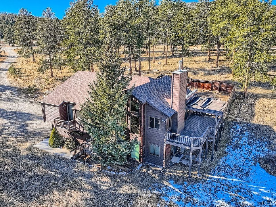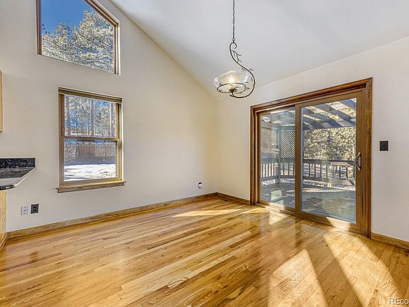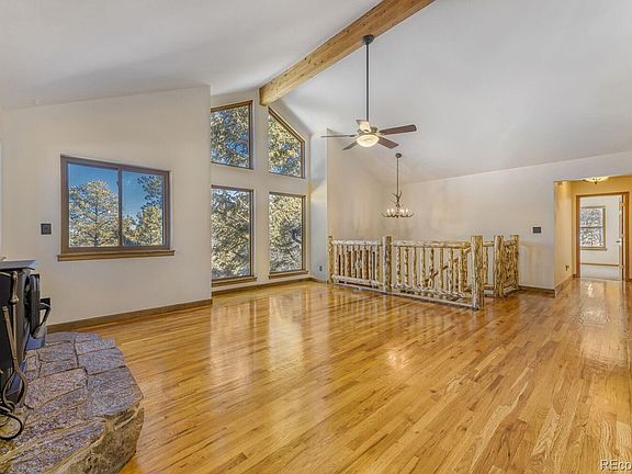 Welcome to your ideal Colorado mountain retreat in Bailey. This home is filled with natural light thanks to a stunning wall of windows that showcases the surrounding views. Inside, beautiful wood floors and a stone fireplace with a wood-burning stove create a cozy, rustic feel. The open upper level features a spacious living room, dining area, and kitchen—perfect for everyday living and entertaining. Step out to the expansive deck with a retractable awning and enjoy peaceful views of your 3.3 acres. A fenced area provides a great space for pets, and the three-car garage offers valuable storage for mountain living.