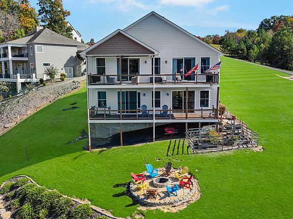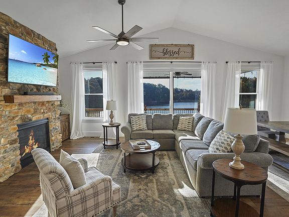 Gorgeous Lakefront Contemporary with Open Floor Plan, 3 bedrooms, 3 full baths and 3,182 Sq. Ft finished. Enjoy the main channel lake views & beautiful sunsets! Great Room with Stone Fireplace. Custom Kitchen w/marble countertops, island and stainless steel appliances. Spacious Primary Suite. The Lower Level is finished with a Family Room with acoustic ceiling tiles, Office area, Exercise area, large bunk area with built in beds and full bath. Large double covered decks with composite decking on each level. The shoreline wraps around to a wide cove with 172' of waterfront that is perfect for the boathouse which has a covered slip w/cabana, electric jet ski lift, 2 jet ski ports and deep water. 2 car garage and paved driveway. Fenced garden area. Only 10 minutes from Westlake area.