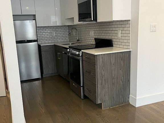 The apartments vary in finishings, with renovated units featuring open kitchens with quartz countertops and high-end cabinets, as well as modern tile bathrooms with walk-in showers.