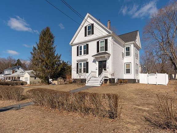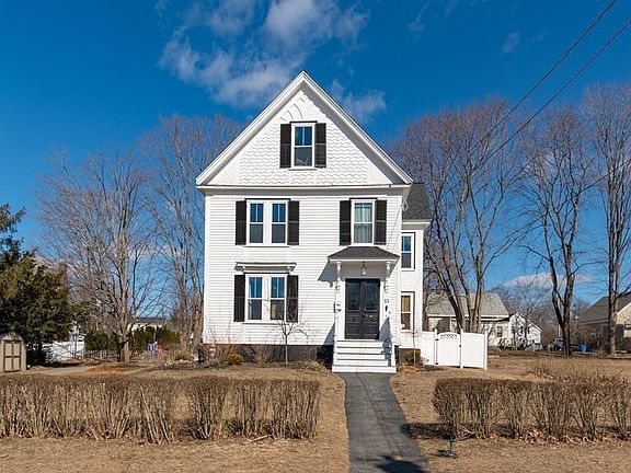 This renovated 1840's Victorian in the charming village section of Merrimac blends architecture and details of yesteryear with the modern look and conveniences of today. Enjoy coming home through the large covered back porch into a modern open floor plan not commonly found in houses from this era. The first floor of this home is an entertainers dream, boasting a new designer kitchen, new half bath, DR, FAM room, front LR with wood burning fireplace and large sunny entry with custom marble inlay. Original wood floors throughout. Two staircases lead to 2nd floor w/4 large sundrenched bedrooms and a full BA w/double vanity. The walk up attic offers AMAZING space and opportunity to add a master suite, family room, or additional bedrooms. The XL yard has 1 side fenced in for privacy, the other is wide open for gardening, play, and still has plenty of space to add a garage. New roof, exterior paint, oversized windows and new gas furnace all recently added.