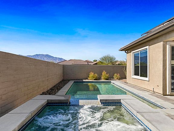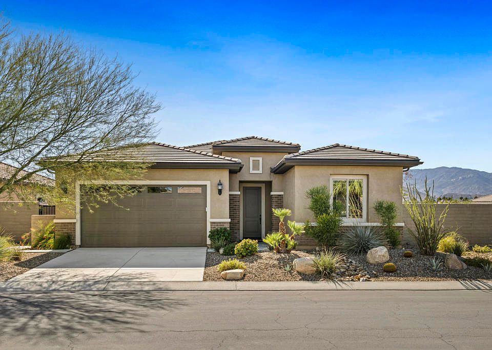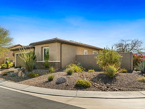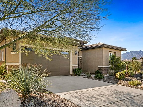 Meticulously maintained, furnished and move-in ready! This highly sought after Refuge model includes 3 bedrooms, 2.5 bathrooms with spectacular mountain views and paid Tesla solar (15 panel upgrade). The home is on an elevated & expanded 9,148 sqft corner lot, professionally manicured, with LED landscape lighting, pristine salt water pool and spa (with tile recently cleaned and water replaced), and large side yard with fruit trees. Upgrades include a gourmet kitchen with quartz counter tops and stainless appliances, including newer GE counter depth refrigerator, Kohler kitchen faucet, GE extra quiet dishwasher, and heavy duty garbage disposal. Floor plan is ideal with guest rooms in the front of the house and primary bedroom on the opposite side, with easy access to the backyard patio and alumawood pergola, firepit and pool/spa. Closet organizers have recently been added to primary bedroom. Laundry room was expanded with utility sink and includes newer GE top load washer. Oversized 2.5 car garage with plenty of room for additional storage. Furnished w/ high quality furniture ,rugs & TVs. Sleep Number king size bed with storage, La-z-boy hide-a-bed and Pottery Barn classic furniture. Outdoor furniture also included. Del Webb Rancho Mirage is a 55+, gated community with guard.