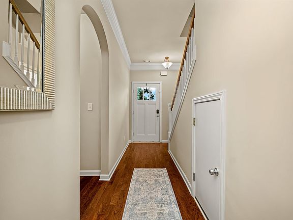This amazing home is one of just two Barrister floor plans available in Edenton. A premium end lot only steps from the pool. The location was carefully chosen for its added charm, including a covered rear porch and extra side windows. The interior features 9-foot ceilings, elegant crown moldings, hardwood floors, an interior courtyard, arched doorways, and a cozy living room with a fireplace. The master suite is generously sized, offering a spacious walk-in closet, and a master bath equipped with a jetted tub and a separate shower. Conveniently, the laundry room is located on the main floor, with easy access to the attached double garage, which requires just one step to enter. The upper level includes a versatile loft area, two additional bedrooms, and a full bath. Additional features include a jetted tub, pull-down attic stairs over the garage for extra storage, under-stair storage access, wired security cameras, and elegant bookshelves. End units don't come around very often! Hurry!