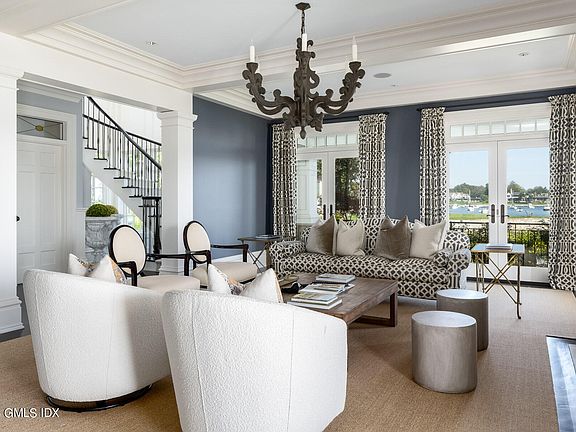 An idyllic waterfront estate, nestled in one of Darien's most wonderful locations. This extraordinary New England residence is direct waterfront offering unobstructed views of Long Island Sound with deep water dock. Incredible attention to detail is evident throughout the nearly 9,000 square feet of living space designed by esteemed architect Robert Cardello with five bedrooms, five full baths and three half baths. The main floor welcomes you with an abundance of natural light, showcasing a grand foyer with a sweeping staircase, formal living room with French doors to a covered terrace, office with incredible views, formal dining room with butler's pantry that seamlessly connects to the open concept kitchen and family room. The primary suite offers a private sanctuary with its domed ceiling and balcony. Four additional ensuite bedrooms on this level provide comfort and privacy while an additional family room on this level offers a cozy gathering space. Third floor is complete with a substantial recreation space, bar, exercise room and a balcony overlooking the Long Island Sound and breathtaking vistas. The property is meticulously landscaped with multiple covered seating and dining areas, an outdoor fireplace and a heated pool with spa complete this exceptional offering.