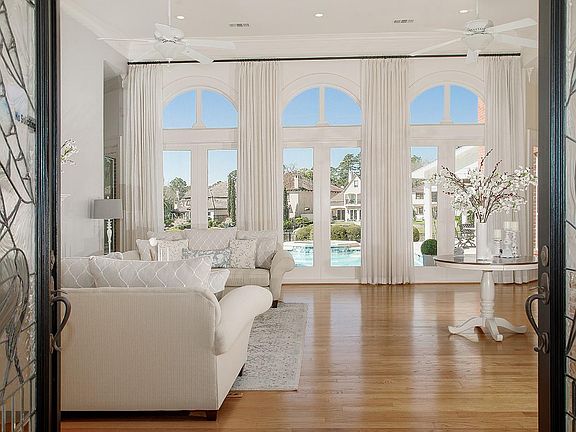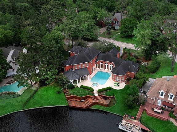 HOME IS OCCUPIED! Outstanding T.D. Cox custom waterfront home in West Isle, within walking distance (or a paddle board or boat ride away) from Hughes Landing, featuring many shops and restaurants. Beautifully remodeled, this home features floor to ceiling windows throughout, maximizing the lake views in nearly every room of the home! Real white oak hardwood flooring, designer light fixtures, and an elevator for convenience. Formal living shares a dual sided fireplace with the study; the light and bright island kitchen with Wolf stainless appliances and wine chiller has a convenient pass thru window to the formal dining, and opens to the breakfast room and den with panoramic lake views; bonus room off the kitchen makes a great 2nd study; huge utility room with sink; owner's retreat down; 3 bedrooms (1 is huge w/kitchenette and could be a gameroom or 2nd master) up; Backyard paradise has recently resurfaced saltwater pool, spa, covered patio, outdoor fireplace, wet bar and boat dock.
