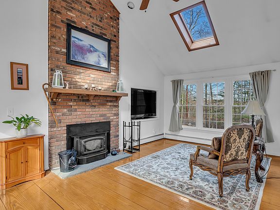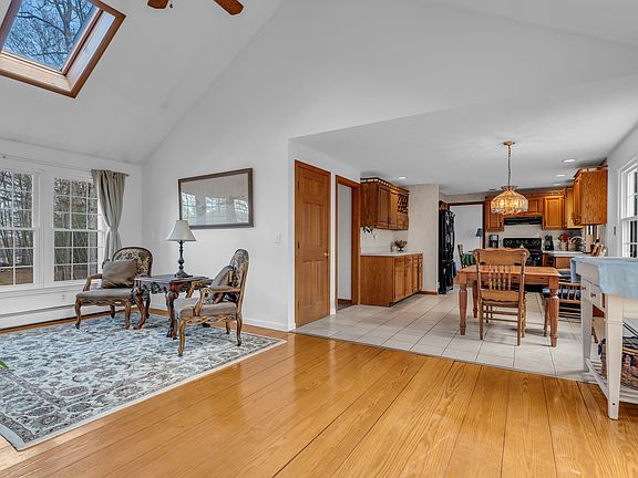 Nestled on a private 4.2-acre interior lot, this inviting 4-bedroom Colonial offers space, comfort, and exceptional value. The home features formal living and dining rooms with beautiful hardwood floors, perfect for everyday living and special gatherings. The living room stands out with its vaulted ceilings, skylight, and wood-burning fireplace with insert-creating a warm and cozy atmosphere for relaxing evenings. The eat-in kitchen includes a convenient pantry and flows nicely for easy entertaining, while a nearby half bath adds everyday convenience. A separate staircase leads to a spacious bonus room on the second level, offering wonderful flexibility for a home office, playroom, or guest suite. Upstairs, the primary bedroom features a full bath and dual closets, accompanied by three additional bedrooms and another full bath. The finished lower level expands the living space with a bar setup-perfect for entertaining or movie nights at home. Outside, the property impresses with its peaceful 4.2-acre setting, offering privacy, open space, and room to explore. The detached two-car barn with loft adds versatility and charm, combining with the home's attached garage for a total of four garage spaces-ideal for car enthusiasts, hobbyists, or extra storage. While tucked away on an interior lot, the home is still part of a neighborhood setting, providing both privacy and a sense of community, all just minutes from town, schools, and local amenities. Do not drive up the driveway without an appointment. Seller has no knowledge of any defects or issues with the property other than those disclosed. The property is being sold As-Is.