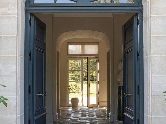 Simmons Lane is the bucolic and amazingly quiet mid-country setting for this French Manor house on 2.25 acres, surrounded by 2.63 acres of forever protected Greenwich Land Trust meadows and woodlands. A new custom home designed , built and landscaped by Cheryl Skoog Tague as a personal residence with exacting care and completed with exquisite materials. There is a sense of durability and essentialness of beautiful architecture. Unsurpassed quality on all levels. Graceful, high ceilinged entrance with a view through to the back terrace and garden. A wonderful wide rear hallway framed by French doors and long windows is on axis with a fireplace on one end and the elegant, reclaimed oak staircase on the other.