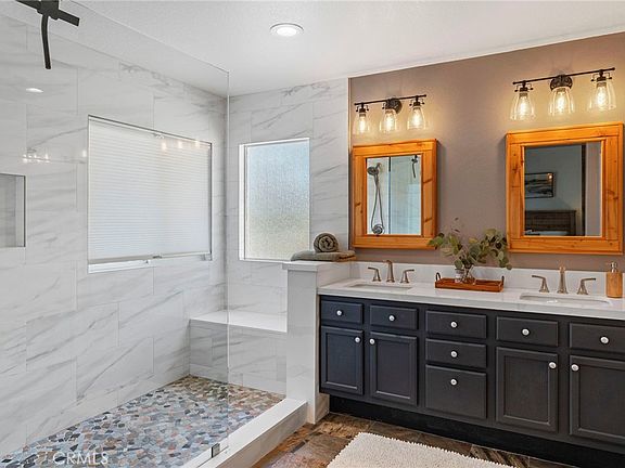 Upstairs, the primary suite serves as a private retreat with panoramic hillside views and high ceilings. The spa-like ensuite includes a barn door leading to a luxurious shower with pebble flooring, a dual vanity with quartz counters, and designer mirrors and lighting. The walk-in closet offers craftsman-style doors and ample storage. Additional bedrooms feature built-in shelving, a built-in desk, and a walk-in closet. The upstairs hallway has bookcases and cabinetry, while the centrally located laundry room maximizes convenience. The secondary bathroom features dual sinks, a bathtub/shower combination.