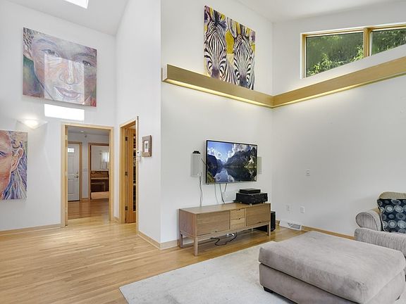 Modern architecture with a contemporary flare defines this expansive 4 bedroom, 3.5 bath home with bonus office/guest suite with private entrance and parking. Professionally landscaped half acre lot on a quiet cul-de-sac in the Village of Cayuga Heights. Main level open floor plan with hardwood floors, handcrafted built-ins, cathedral ceilings, skylights and large thoughtfully placed windows to maximize southern exposure. Spacious main level primary suite includes attached bath with whirlpool tub and large walk-in closets that connect to laundry room. Sunny upper level has 3 generously sized bedrooms and full bath. Stunning indoor pool space that has been converted into a rec room can easily be turned back for use as a pool. Best of all Worlds converge with this property! Great space inside and out with endless possibilities. Ideally located close to schools and as conveniently located to Cornell and Downtown Ithaca.