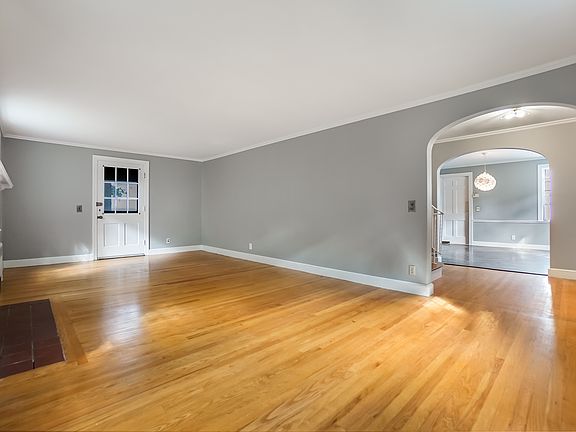 Step inside to an expansive living room with hardwood floors, fireplace, and arched entryways. Off the living room, a bright three-season screened porch overlooks the large, private backyard ideal for outdoor dining or relaxing evenings. The formal dining room features elegant molding and modern lighting, flowing into a wood-paneled study with built-in shelving and cabinetry. A retro-inspired half bath adds style and convenience.