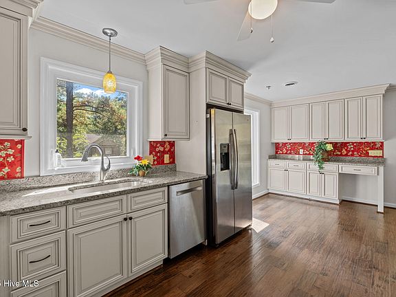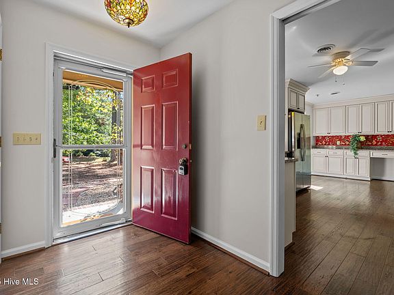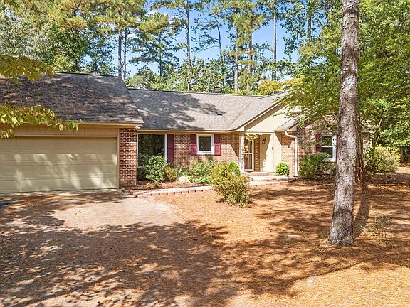 All brick, remodeled charmer in the Heart of Whispering Pines! This quiet 2 bedroom, 2 bath home sits on a knowl overlooking a spacious front yard. Wood floors throughout, windows galore, open and flexlible floor plan lets the sunshine in! A Beautiful and Cheerie kitchen offers ample counter space with custom cabinets and granite counter tops. Breakfast area sits in front of a large window overlooking the picturesque front yard. Open living room/dining or family room combo is graced by a gas fireplace with an authentic antique mantle! This fabulous living area has a large picture window and 3 sets of sliding glass doors to bring the outdoors in. Enjoy the view of the spacious fenced yard, complete with extensive pergola covered and open patio and garden shed, complete with electric. Spend your days in the heated and cooled Carolina Room designing your own Secret Garden. Spacious Primary Bedroom has two wall closets and a walk thru closet leading to a very private primary bath with vaulted ceiling, double sinks and a dressing area. Comfy second bedroom, hall bath and hall linen closet, large laundry room with walk in storage closet and two car garage, complete the picture. Lots of space inside and out. Great for entertaining or creating your own private retreat. Don' t wait. This one is Special!