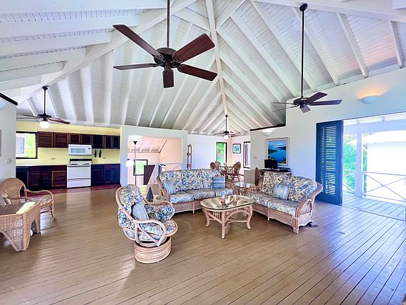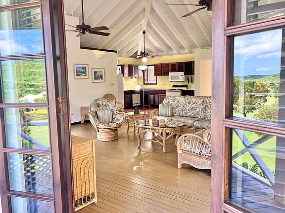 Annual Golf Membership Included with Purchase!Welcome to Sweet Lime Village, an exclusive community of just 30 stand-alone villas. Villa #11, the last on the road, enjoys a prime east-facing position, capturing refreshing breezes and stunning pastoral views. Overlooking hole #2 of the Carambola Golf Course, you can watch golfers tee off right from your porch.Upper Level: Open, Airy & InvitingThe upper level features an expansive open concept living area with solid wood floors, high ceilings, and abundant natural light. French doors, crafted from carefully maintained original imbuia wood, open to a wraparound porch, perfect for enjoying the view. The kitchen flows seamlessly into the living space, with an adjacent office/sitting room and a half bath. The covered balcony provides ample room for relaxing or grilling while soaking in the lush surroundings.