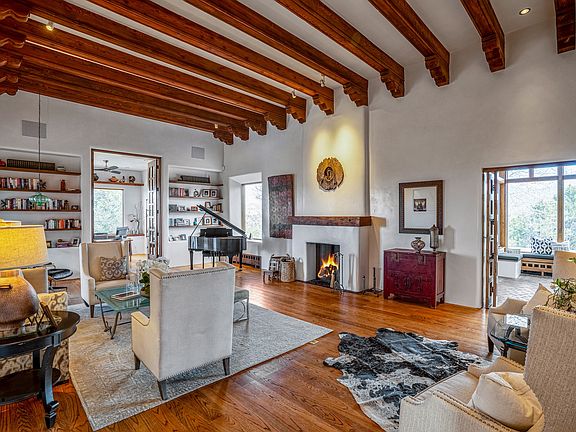 Within minutes of the Plaza, this single level 5647 sq. ft. 3 bedroom/ 3 bathroom adobe home is located off of Circle Drive and sited on 10 premium acres with panoramic views of the Sangre de Cristo and Jemez mountain ranges. With towering cottonwood and magical grounds, the estate was the original structure in what is now the Tesuque Ridge subdivision and is located within the gated community of Tesuque Ridge, but not a part of the Tesuque Ridge homeowner’s association. In 2013, the property was renovated, beautifully melding the authentic Pueblo Revival architecture and the current, contemporary aesthetic. This impressive estate has the unique combination of a majestic AND soulful home. The property has an elegant living room with 16’ beamed ceilings, oak flooring and a commanding fireplace. A beautiful glass enclosed sunroom with French doors connects the interior living space with the outdoor living areas, offering breathtaking views of the Sangres. The formal dining room continues the sophisticated Southwestern aesthetic with beamed ceilings, brick floors and a glass-enclosed wine cellar with retractable blinds, adding extra drama to this extraordinary space. The kitchen, the social heart of the home, has a contemporary feel with white Silestone countertops, stainless steel appliances, a kiva fireplace and multiple areas for gathering. In the bedroom wing, the primary bedroom suite was also re-imagined with a classic contemporary meets pueblo aesthetic and connects to a modern bathroom with an elegant Victoria + Albert soaking tub and Jemez mountain views. The property has 2 large, guest bedrooms with ensuite bathrooms, a view-filled private office off of the main living area, and a lower level media room. Within 5 minutes of the Plaza, dramatic views, 10 acres, enchanting grounds and a completely renovated adobe estate, 11 Tesuque Ridge is a true Santa Fe treasure.