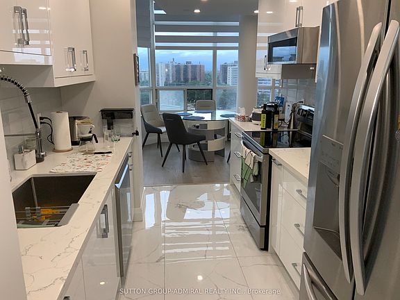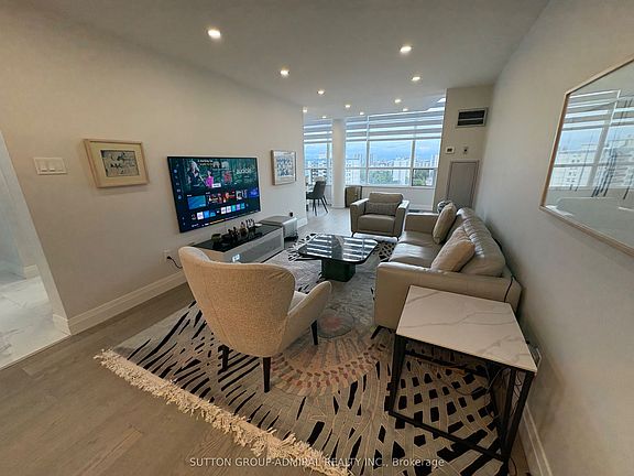 FULLY RENOVATED & FURNISHED PENTHOUSE UNIT! This stunning penthouse offers top-of-the-line designer finishes throughout. Enjoy an abundance of natural light with massive windows and remote-controlled blinds, showcasing breathtaking southwest clear views from a large balcony.The unit has been completely redone with extensive high-end features, including wide plank flooring, smooth ceilings, and beautiful moldings. The modern open-concept kitchen is a chef's dream with ample counter space, a breakfast bar, quartz countertops and backsplash, and all-new appliances. Both washrooms are fully tiled with exotic porcelain floors and walls. The bedrooms have a perfect split floor plan, and custom built-in organizers offer plenty of closet space. A unique feature of this unit is the four parking spots (two individual spots and one tandem spot) and a storage locker conveniently located on the same floor. The building is exceptionally well-maintained, quiet, and offers an array of amenities, including an indoor pool, party room, gym, tennis and pickleball courts, and concierge. Its prime Thornhill location is within walking distance to parks, TTC/Viva, grocery stores, and endless amenities. Rent includes all utilities, even cable.