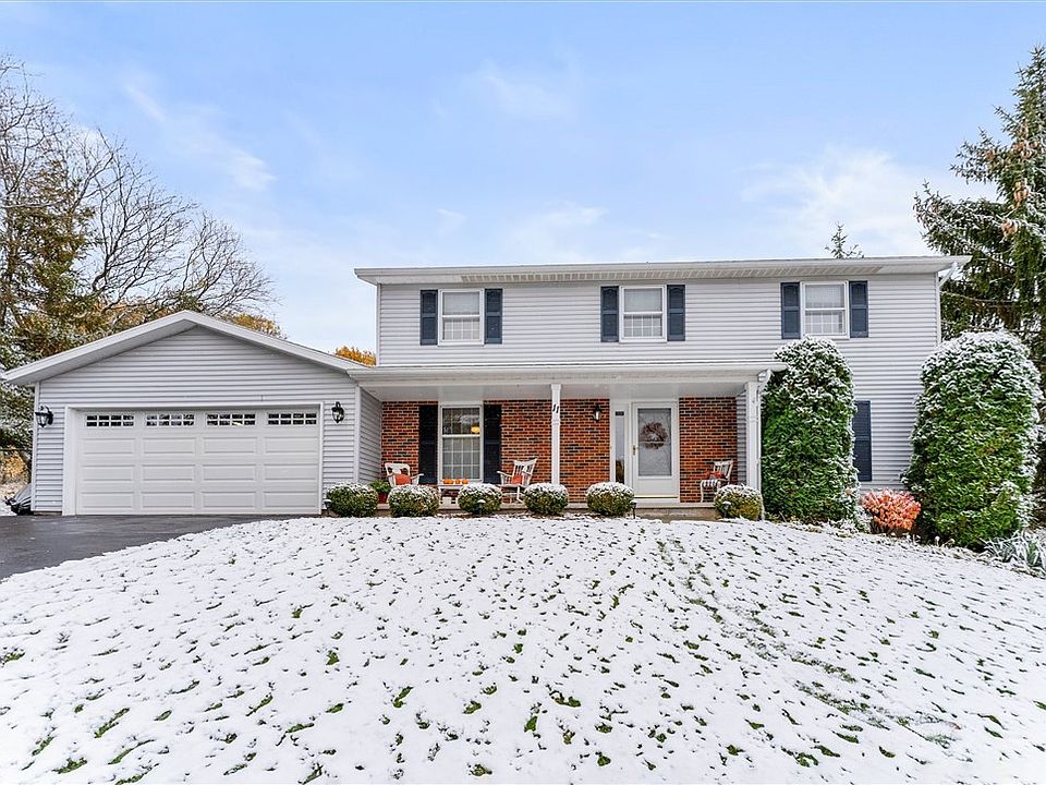 Welcome to this well-maintained 1983 Colonial by VinMasc Construction, offering 1,824 SF of living space with 4 bedrooms and 2.5 bathrooms. An inviting open front porch leads into a foyer with coat closet. To the right, a living room provides a comfortable space for relaxing or entertaining. To the left, a formal dining room offers an ideal setting for gatherings and special occasions. Straight ahead, the eat-in kitchen updated in 2017—opens to a spacious family room featuring a masonry wood-burning fireplace (chimney crown replaced and flue serviced ’24). The kitchen includes quartz countertops with undermount sink, custom Mennonite cherry wood cabinets with soft-close, pot drawers, pantry, gas range, built-in microwave, refrigerator, dishwasher, disposal, tile floor and backsplash, creating an inviting space for everyday living and entertaining. A half bath sits conveniently near the garage entry. A beautiful wood banister leads upstairs, where the large primary bedroom features a walk-in closet and private bath with tile floor, tile shower, and vanity. Three additional generously sized bedrooms share a main bath with tile floor, shower, and laundry chute. Beautiful wood doors throughout add warmth and timeless character to every room. Attached 2.5-car garage includes a 200 Amp electrical box, and the completely dry basement offers plenty of storage with washer, dryer and workbench. Step outside to a 16x16 Trex deck with vinyl railings overlooking private trees, with space for a garden. The backyard features a grape trellis behind the garage and a cast iron chiminea, perfect for outdoor enjoyment. Recent updates include a new roof with plywood sheathing (no particle board) and transferable warranty ’24, Rheem HWT ’24, Andersen vinyl-clad double-pane maintenance-free windows with storm window/screens, furnace, and Trane high-efficiency central AC (‘09), making this home truly move-in ready. Conveniently located across from the new Chapman Park, with the fire station and post office just steps away, and shopping and dining only minutes from home. Delayed Negotiations: Tuesday (11/18/25) @ 9AM