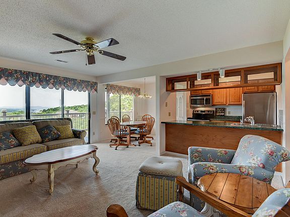 VIEW! VIEW! VIEW! Panoramic Table Rock lakeview from nearly every room of this neat and clean 2 bedroom, 2 bath condo with use of 2 car garage!!! Partially furnished with stainless appliances and large walk-in closet with washer/dryer in primary bedroom. The huge deck with access from the living room and the primary bedroom is where you will spend most of your time. Plenty of room for your car and your lake toys with a 2 car garage below the unit (Exclusive right to use garage). Has not been used for nightly rental, however is in PRIME location with less than 5 minutes to Silver Dollar City and Table Rock Lake. DIRECTION TO GARAGE: By car - go behind and under Building 10 to Building 11 garages. Second garage door from left. By foot - go out front door of unit and straight down stairs. Second garage door on right.
