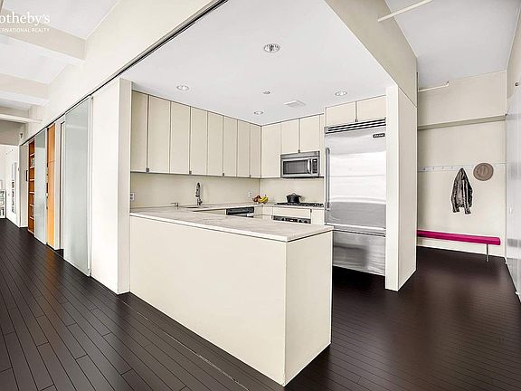 With many rooms to roam, this sprawling NoMad loft delivers floorplan optionality and design potential to create your dream loft. With south, west and east exposures, the space is imbued with beautiful sunbathing light from morning until evening. The welcoming foyer with its modern aesthetic features an architectural niche, art walls and closets galore. The foyer opens into an expansive great room with open concept living, dining, cook’s kitchen with marble counters and pantry storage. The designed blends clean lines with a comfortable contemporary elegance. Sliding doors reveal an office with built-in desk, twin bed and shelving. The hallway to the private quarters offers sliding doors concealing additional office shelving, library shelves or custom display cabinetry. Private quarters include two guest rooms which can be connected via a pocket door and a west facing primary suite with en-suite bath, glass enclosed shower, soaking tub and custom vanity. High 11’ ceilings offer cubic volume for additional storage and gallery sized walls for art. There is an additional full bath with shower. Other features include: