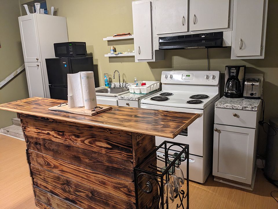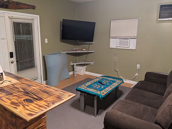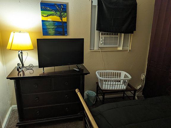 Nice, cozy one bedroom apartment available for one to 6 month lease. Comes completely furnished with stove/oven, apartment-size refrigerator, 55" mounted smart TV. Laundry on premises. Drive up parking right in front of unit. Comfortable queen size bed. Unique bar dividing kitchen and living room. Very comfortable couch. Completely furnished kitchen with plates, silverware and coffeemaker.