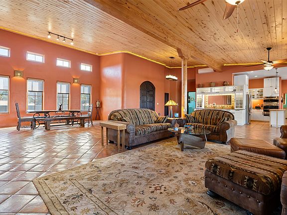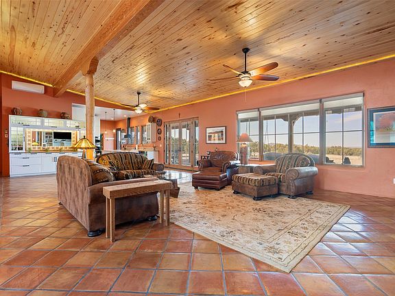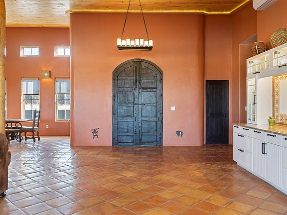 This stunning 3 bedroom, 4 bath sanctuary boasts 42 serene acres situated at the foot of the rugged Ortiz mountains with drop dead gorgeous views of the Sangre de Cristos. High ceilings and an open concept kitchen/living area accented with beam ceilings and Saltillo tiles provide the main dwelling with a cozy, yet spacious rustic elegance. High ceilings in the living and dining area flow beautifully to the expansive portal, making this an ideal home for entertaining.