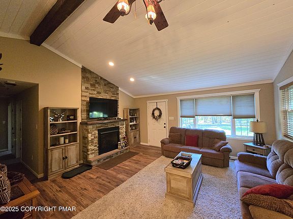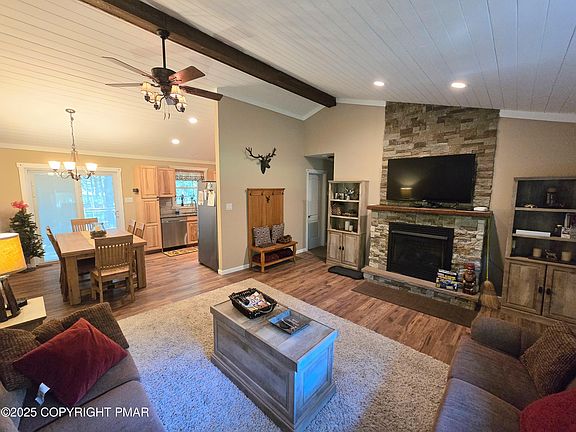 Charming Ranch Home with Spacious Living & Modern Touches. Welcome to this well-maintained ranch-style home offering comfort, space, and convenience. Step into the open concept living room featuring a stunning stone-faced fireplace and vaulted ceilings, creating a warm and inviting atmosphere. This home features three comfortable bedrooms and a modern bathroom with a walk-in shower. The recently remodeled kitchen offers granite countertops and a functional layout that flows into a bright dining area. Additional highlights include a spacious rear deck, a full, unfinished basement offering endless storage or future living space possibilities, a forced hot air heating system for year-round comfort, and thoughtful updates throughout. This home is located in the gated community of Indian Mountain Lakes, offering 5 lakes, trails, pools, tennis and basketballs courts, road maintenance and SO MUCH MORE! Don't miss this opportunity to own this delightful home! Call TODAY for more information and schedule a private showing!