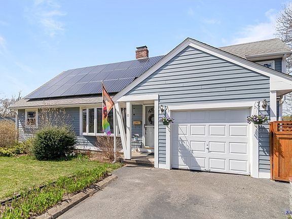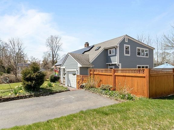 Tucked away in the heart of this popular neighborhood, you'll find this expanded sun-filled 4/5 bedroom cape with 24 fully paid-off solar panels that substantially reduce the electric bill. Enter into the cheery living room with a bow window and fireplace, large dining room with storage, an office/bedroom, full bathroom, well-appointed eat-in-kitchen with a view of the lovely flower-filled yard and a large family room with high ceilings, beautiful windows, and a wood-burning stove. A mudroom finishes off this floor with access to the side yard and driveway. The 2nd floor boasts 4 good-sized bedrooms, including a large bright primary, an adorable sitting area and another full bathroom. The basement has a partially finished area, set up as a children's playroom. There is a beautiful stone patio in the side yard with mature plantings, where the sellers have hosted many outdoor get togethers. Prime Natick location 1 mile to the town common and MBTA station and 2 miles to Wellesley Square.