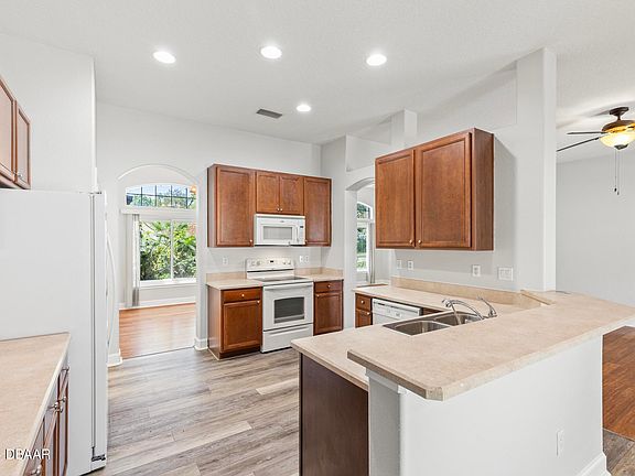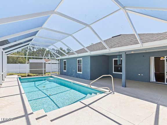 Welcome to this charming 4-bedroom, 2-bathroom pool home, boasting a BRAND NEW ROOF. Natural lighting floods the interior, highlighting the spacious bedrooms and luxury vinyl flooring that flows seamlessly throughout the home. Step inside to discover a freshly painted interior and volume ceilings that create an open atmosphere. The split floorplan provides privacy and convenience, while the centrally located kitchen boasts wood cabinets for ample storage. Outside, a covered lanai area by the custom pool with a soothing waterfall feature invites relaxation. The fully fenced yard includes a storage shed, and a screened-in pool. Plus, the home's proximity to Target, I-95, Flagler Beach, and other amenities ensures convenience. Schedule your showing today!