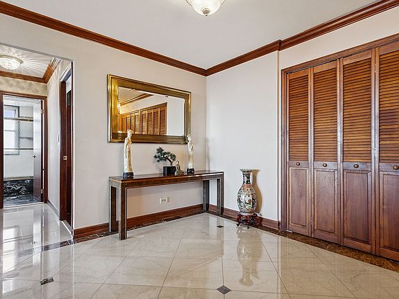 Upon entering this pristine apartment you are greeting by a marble tiled entry foyer with floor to ceiling closets. Just beyond the foyer is a sunny, expansive living room that leads to an enormous terrace with sweeping views. From the east you can view the water, from the the west, you can see from downtown Brooklyn to the tip of upper Manhattan.