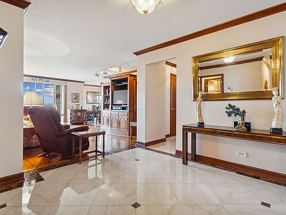 The primary bedroom has oversized windows and a large closet. Off the primary, is a full bathroom with a shower/tub combo and marble countertops. The sizable second bedroom has oversized windows and a deep closet. The second full bath has a shower/tub combo with marble accents. This apartment has Central Air and Heat, new hardwood floors and marble tiled flooring in the entryway and dining area.