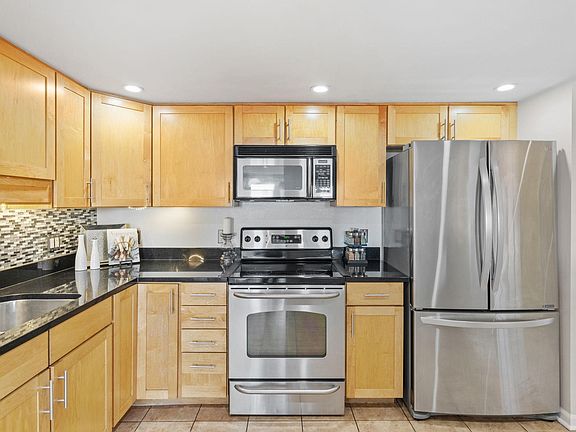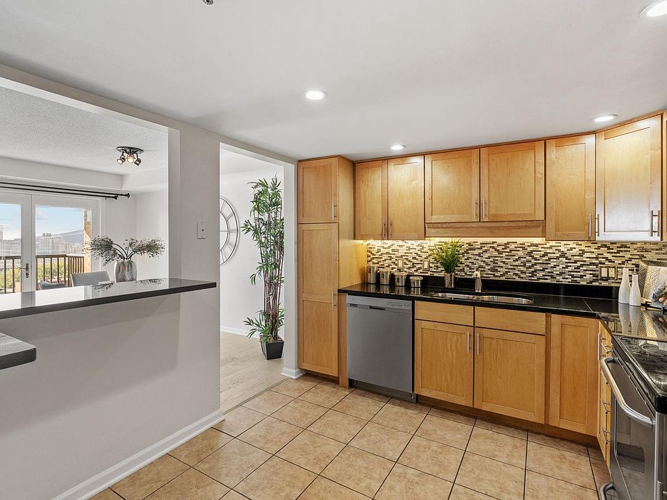 White oak hardwood floorsSleek black granite countertopsStainless-steel appliancesPrivate terrace