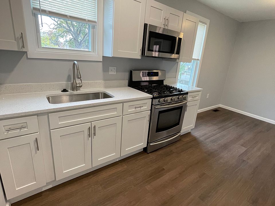 -Kitchen has white shaker cabinets with soft close drawers, white pearl quartz countertops, with an undermount sink.