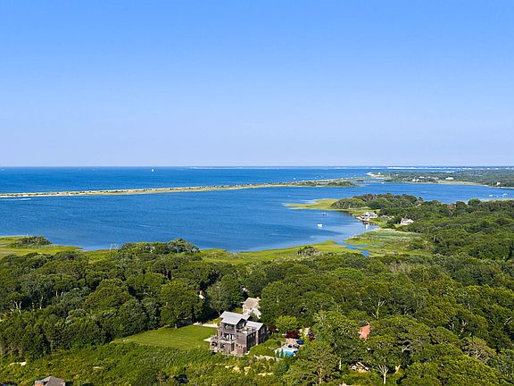 Water views with a pool! This chic contemporary 4-bedroom home with a pool and 2-car garage enjoys the ever-changing water views of Sengekontacket Pond and Nantucket Sound on three levels. Fully renovated, this delightful home, being sold turnkey, is flooded with light, open to breezes, and marries a timeless Vineyard vibe with modern luxury. The mudroom entryway opens to the kitchen with an expansive breakfast island, dining room, and living room with a gas fireplace. Sliders from the living room open to the heated pool and hot tub surrounded by granite pavers. The kitchen shares a view of the pond and Nantucket Sound through the wall of windows and sliders in the dining room out to the deck, a perfect spot for outdoor dining. A wine cooler in the dining room has a pass-through space above it to the adjacent family room. The open floor plan lets the cook connect with family and guests. Beyond the kitchen, accessed through a sliding barn door, is a cleverly placed office with built-in bookshelves and sliders to the deck. A pantry, half bath, laundry, and another mudroom adjacent to the outdoor shower complete the first floor. The views of Sengekontacket and Nantucket Sound become more dramatic on the second and third floors. There are 4 bedrooms on the second floor, including 2 primary suites, all with vaulted shiplap ceilings, as well as a den and a shared bath. The den and one of the suites have private decks that capture the essence of the views. A second sliding barn door opens to the den, creating a private primary wing at the front of the house. An outstanding spiral staircase provides access to the fabulous “Lookout Lounge,” where you will enjoy exceptional views inside and outside on 2 decks. The professionally landscaped yard includes a perennial garden, mature trees and shrubs, and a rolling lawn with a fire pit. It’s only steps away from the hiking trails of Felix Neck Wildlife Sanctuary, a short trip to the town landing, and an easy drive or bike ride to downtown Edgartown. With ample spaces for relaxation, entertainment, and multiple living areas, this home is the perfect Vineyard experience.