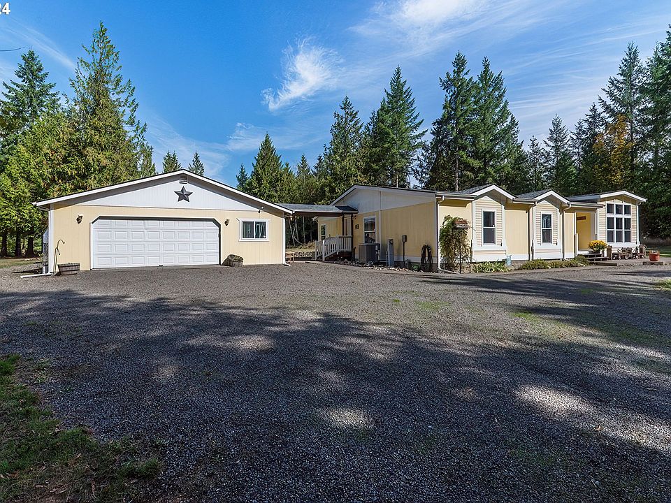 Need to be within 5 minutes to the I-5? Wanting a place to be free of the city hustle and bustle? This is it! Property offers 2.84 LEVEL acres with large trees. You can buy with confidence with recent upgrades of roof on garage and house, new AC unit, new well pump plus a water filtration system installed, and drain field. New LVP flooring in dining/living/office spaces. Home offers open concept w/Primary and 2+ guest bdrms on opposing sides. Office leads into Primary w/windows looking East to see the sunrises. Garage is 30x46, has electric opener, wall-lined shelving PLUS insulated exercise/retreat studio built at very back. Backyard offers firepit sitting area and even more yard beyond-come and see! Property backs up to private tree farm.