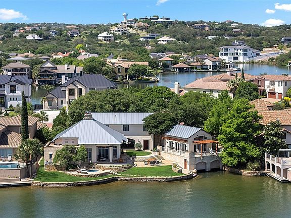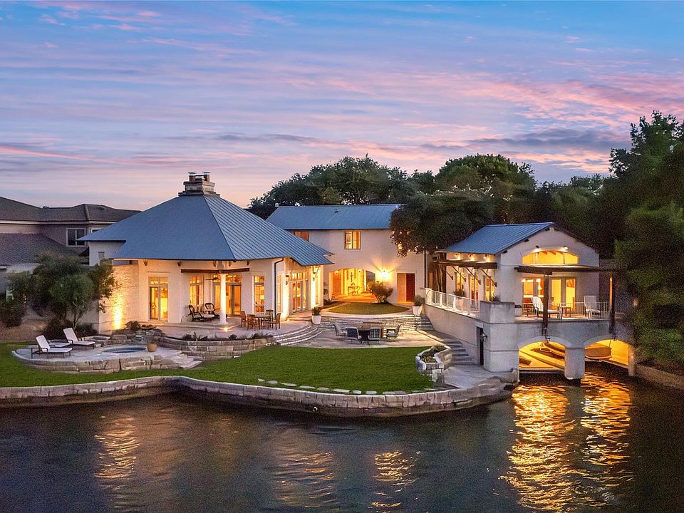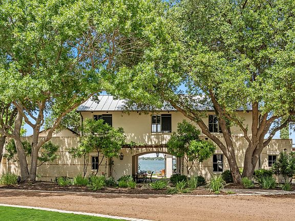 This custom-built residence was designed by acclaimed architects, Overland Partners, known for the design of the Lady Bird Johnson Wildflower Center. Located within gated & guarded Applehead Island community, it sits on one & a half lots with prime open lake front views across from undeveloped land. Multiple limestone patios & covered terraces connect large front & back yards by a central breezeway. The stunning vaulted & beamed living room with large windows capitalize the lake views. Open concept - the kitchen connects to living & dining. Primary suite features his & her baths. Library & additional home office. Guest house with kitchenette & terrace. Oversized 2+ car garage & full workshop. Private hot tub & fountain. This home optimizes natural light, craftsmanship & privacy with 153 linear feet of lake frontage. Walkable to the pool & tennis courts & convenient to Escondido. A true architectural gem; its design has inspired many of the homes on lake LBJ - a constant level lake.