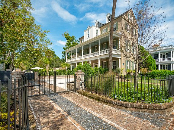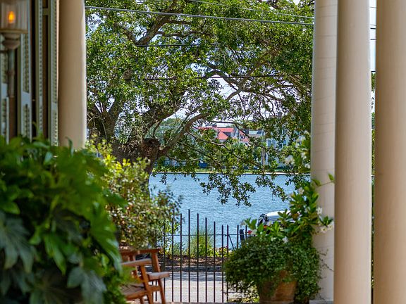Step into Charleston's history at 110 Beaufain Street, a stunning masonry Charleston Single built in 1838 and masterfully restored for modern living. Once home to merchants and mayors, this Neoclassical and Greek Revival residence offers a timeless presence overlooking historic Colonial Lake in the heart of downtown's historic district.Restored and designed by Ben and Kate Towill of Basic Projects with landscaping by Ables, the four-bedroom, four-and-a-half-bath home spans three stories plus an finished attic space. It underwent a meticulous renovation approved by the Architectural Design Board, preserving original character while introducing elegant updates throughout. The 200-year-old plaster walls restored, original sanded down heart pine oak floors, historic mahogany windows upstairs, and reshaped, hand-sanded original trim blend seamlessly with new elements like stained-glass doors, a simple, sophisticated kitchen with carrara marble counters, aged brass hardware, Thermador appliances, and a snug perfect for cozy evenings. The den features a fully restored wood burning fireplace and the most exceptional views of Colonial Lake, with the home set back on the property to provide a quiet, private setting rarely found in this location. The primary suite serves as a private retreat, complete with a soaking tub, dual solid marble sinks, a walk-in closet with custom lighting, and direct access to the second-level piazza, where soft breezes drift in from the lake. Upstairs, the third floor offers bright, spacious bedrooms with full en suite baths and closets. A versatile attic space provides additional room for a bunk area and home office, perfect for guests or a quiet workspace with views across the lake. Outside, the private courtyard and landscaped gardens are centered around a saltwater pool with a spa and a pool house with all hook-ups for a sauna and cold plunge, creating a serene retreat ideal for both relaxing and entertaining. The home's design feels both high-end and comfortable throughout, from the interiors to the outdoor living spaces. The brick and oyster tabby driveway offers unmatched parking for three cars, a rare convenience on the Peninsula. Blending original architectural details with modern luxuries in a premier location, this home offers a rare opportunity to own a piece of Charleston's rich history.