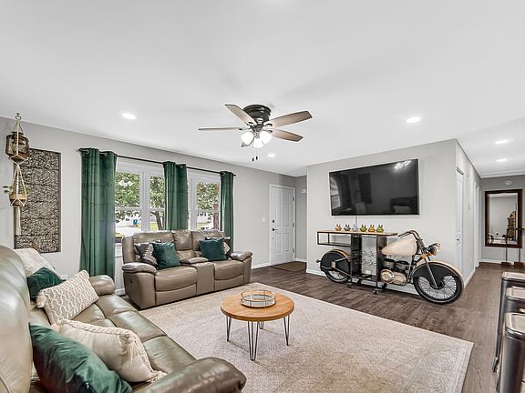 - Description: The Living Room has new luxury vinyl flooring, a new picture window, trims and snack counter seating to the kitchen. New lighted ceiling fan too! It is versatile when entertaining! This beautiful flooring leads you to every room in the house!