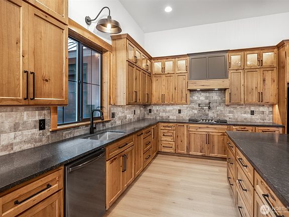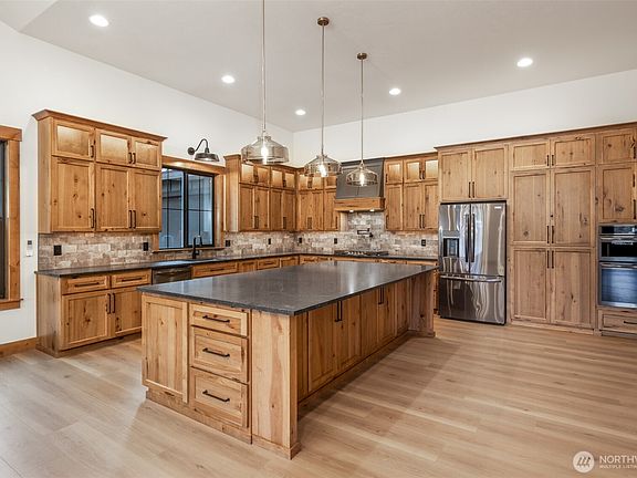 High end luxury rambler near Lake Cle Elum. This private neighborhood has access to Roslyn Ridge community center & pool while being tucked away on a large 1+ acre lot. 12ft ceilings thru out with an 18ft vaulted living room boasting a floor to ceiling stone fireplace with oversized mantle. Huge kitchen with an extra large island and a hidden pantry, no shortage of storage here! Under cabinet lighting, glass upper cabinets with lighting and tons of space to entertain makes this kitchen the center of the home. All 3 guest bedrooms have 12ft ceilings. Both bathrooms offer heated floors and the master has a massive walk in closet and walk in shower. Covered front and rear patios and pre wired for hot tub, electric car charger and generator
