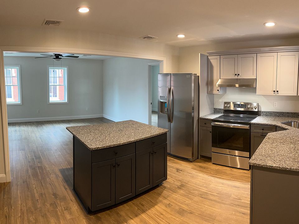 The brand-new kitchen is thoughtfully designed with contemporary appliances, an island with seating for two, and fresh plank flooring that flows throughout the living areas. Convenience is built in with an in-unit washer and dryer, a private covered entry directly into the apartment, and onsite parking with a reserved space plus covered bicycle storage.