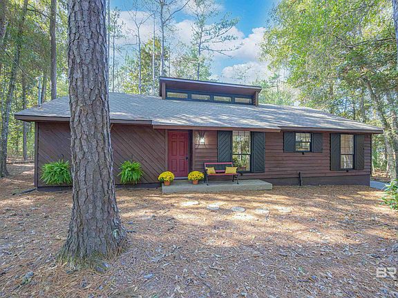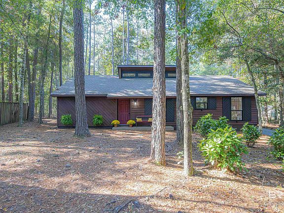 Peaceful & Unique Cabin Retreat in the Woods of Lake Forest. Tucked away at the end of a quiet cul-de-sac in Lake Forest, this one-of-a-kind cabin sits on a partially wooded lot surrounded by pine trees, offering both privacy and peace. The home's rustic design features rough-cut lumber in creative diagonals—inside and out—giving it a character unlike anything else on the market. Inside, a beautiful stone fireplace anchors the living room, while vaulted ceilings with exposed wood beams and skylights fill the home with warmth and natural light. The updated kitchen offers a fresh contrast to the wood tones, with white cabinetry, granite countertops, and stainless steel appliances. The primary suite feels like a private retreat, complete with sliding doors that open to a peaceful patio overlooking acres of forest beyond. The ensuite bathroom has been tastefully updated and features double sinks, ample storage, and a walk-in shower. A generous walk-in closet completes the space. On the opposite side of the home, two additional bedrooms share a full bathroom with a tub/shower combination. One bedroom connects directly to the bathroom and has a separate entry—perfect for guests, a home office, or multigenerational living.Additional features include: Beautiful wood-look laminate floors throughout, Covered carport and small attached shed, Laundry room with stacked washer and dryer, Central heating and air , Whole-house generator powered by a 500-gallon propane tank, Working hurricane shutters for added security and peace of mind. Outside you'll find yourself surrounded by nature—shaded by tall pines and embraced by the stillness of the woods. It's a setting that feels worlds away, yet only minutes from shopping, dining, and I-10 access. Buyer to verify all information during due diligence.