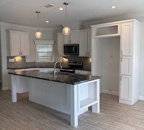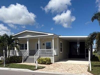 Heron Model, nearly 1,500 square just came available! The home is accompanied with a paved entrance, clean uniformed landscaping, full porch and carport with your personal storage shed. Three bedroom space is equipped with retro ceiling fans and two bathrooms completed with mosaic 8\" tile backsplash. Full stainless steel appliances fitted with a farmhouse sink, deluxe refrigerator, built in microwave and full range oven. Turin vinyl flooring through with welcoming carpets in rooms. 5' crown molding and base boards in entire home. For those looking for an active 55plus community with resort style amenities, full of value for the investment with classes, parties, events, happy hours music and yes, we are pet friendly hosting two dog parks. The home is located just a short walk away from the 30,000 Sq. Ft. Amenity Center. When the grands visit, bring them to the Olympic style pool, ping pong, mini golf course, bocce, shuffle board, billiard room or fitness center and pickleball courts. Stop searching and start living a dream lifestyle, conveniently