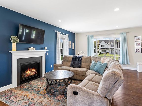 Located in Burrillville, right near Crystal Lake Golf Club, Steere Farm Estates was built to combine serene natural surroundings and tasteful modern living. This 3-bedroom, 2.5-bath home on a picturesque landscape, tended by built-in irrigation, begins with a covered front porch with low-maintenance composite decking. Step into the main level with hardwood floors throughout. A gas fireplace, picture window, and large sliders add pleasing light to the living area, dining area, and kitchen. A pantry closet, shaker cabinets, stainless appliances, stone counters, and a center island for informal dining add style and function. The railed rear deck lends more room to entertain with steps down to the sizable backyard and built-in fire pit. A mudroom, access to the attached 2-car garage, and a half bath complete the 1st floor. Upstairs, the owner’s suite has a walk-in closet and private bath with a dual-sink vanity and step-in shower. The remaining bedrooms sit near a convenient laundry room, dual-sink hall bath, and finished bonus space. The walkout basement is ready to be finished to suit your needs, while central A/C ensures comfort throughout this modern stunner. Discover Northern RI’s pristine lakes and protected forest areas for hiking, fishing, and swimming. Restaurants and the Assembly Theatre are nearby, along with local farms for fresh produce. The home is also less than 20 minutes from Bryant University.