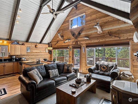 Fully furnished mountain retreat near Lake Cle Elum in a wooded setting with secluded end of the road location & peek a boo lake view. Well-rated part-time vacation rental, sleeps 8, completely turnkey with newer furnishings, multiple updates, & rustic accents. The well-designed open plan features a vaulted great room leading to a spacious deck, perfect for entertaining. Primary bedroom & full bath on the main w/sleeping loft above. Downstairs rec room has a bedroom, 3/4 bath, bonus room, plus a wet bar, & woodstove. Nicely landscaped, with a stamped concrete patio, hot tub, firepit, & ample outdoor seating. Enjoy use of Pineloch Sun's community outdoor pool, lakeside lodge, sports courts, & access to miles of trails.