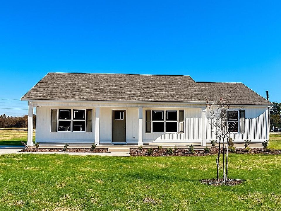 The Brandon-Welcome to this charming new home featuring a grand front porch is perfect for rocking chairs, porch swings, and evenings outdoors. Step inside to find a bright, open layout highlighted by a vaulted ceiling and luxurious LVP flooring. The family room showcases a beautifully accented fireplace with elegant trim. The dining area is conveniently located just off the kitchen and provides access to the covered back patio. The kitchen impresses with granite countertops, tile backsplash, an eat-at bar, built-in pantry, and ample cabinetry. Privately situated on one side of the home, the primary suite offers a spacious walk-in closet and a stylish bath complete with double sink vanity, granite countertops, and LVP flooring. Two additional bedrooms, each with walk-in closets, share a full hall bath with granite countertops and LVP flooring. Step outside to relax under your covered back patio and enjoy views of your expansive backyard that is the perfect spot to unwind or entertain. Welcome home