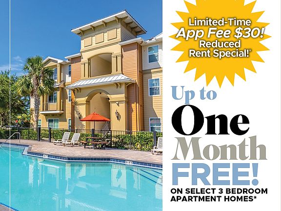 - Special offer! Up to One Month Free on Select 3 Bedroom Apartment Homes* For a Limited Time, App Fee is only $30! *May be subject to being split over three(3) full months of residency. Must move in by 10/31/25. Restrictions apply, contact leasing office for details.